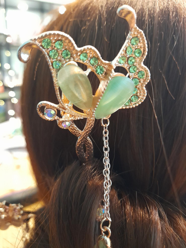 Pincho en forma de mariposa dorado con piedras.