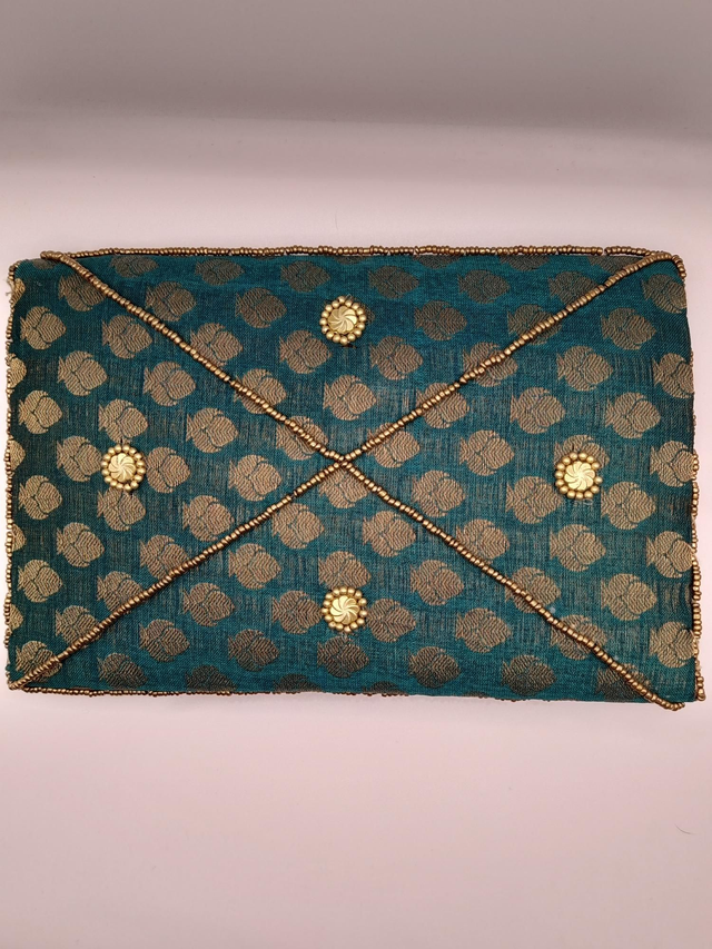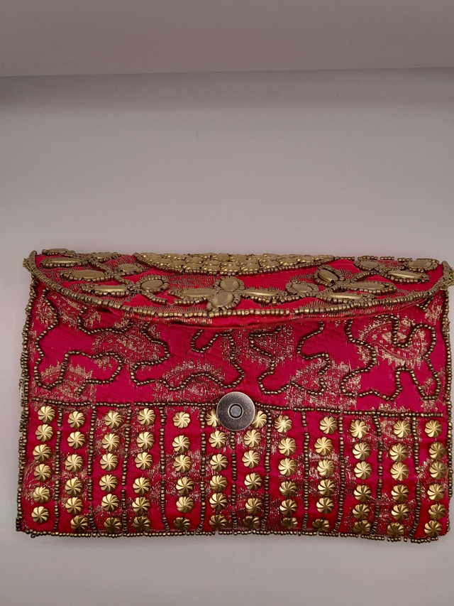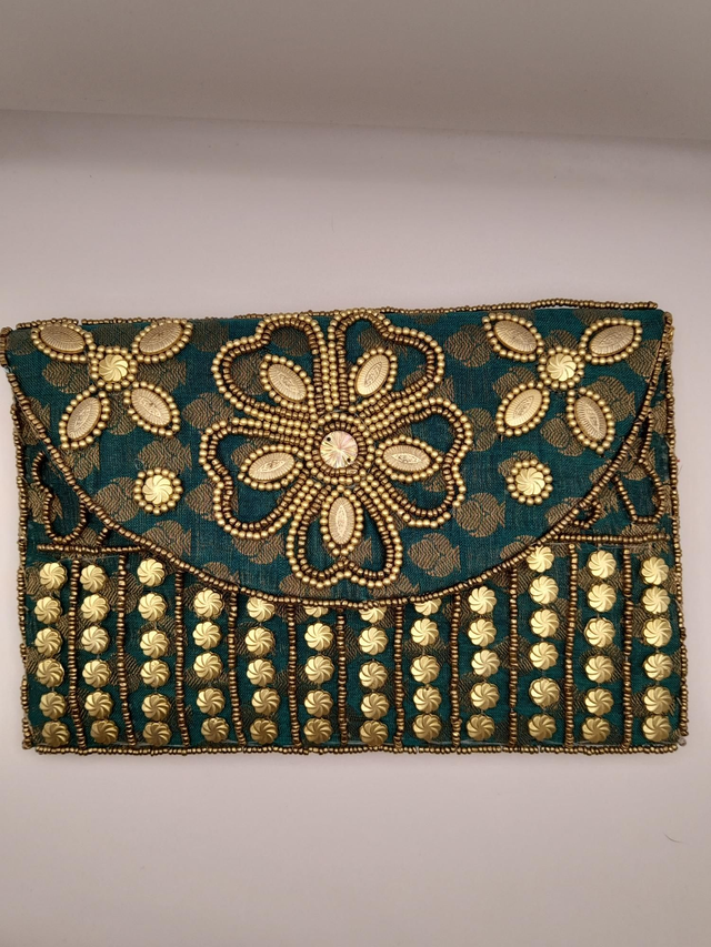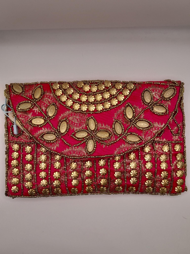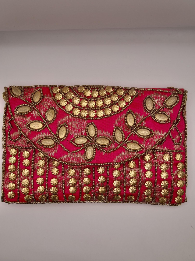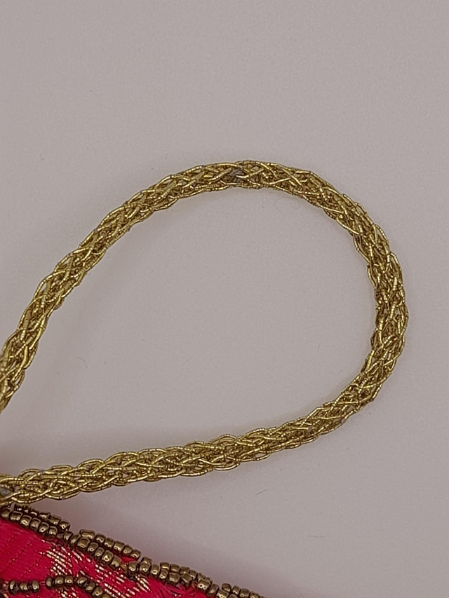 Confeccionado a mano, raso con cuentas doradas.
